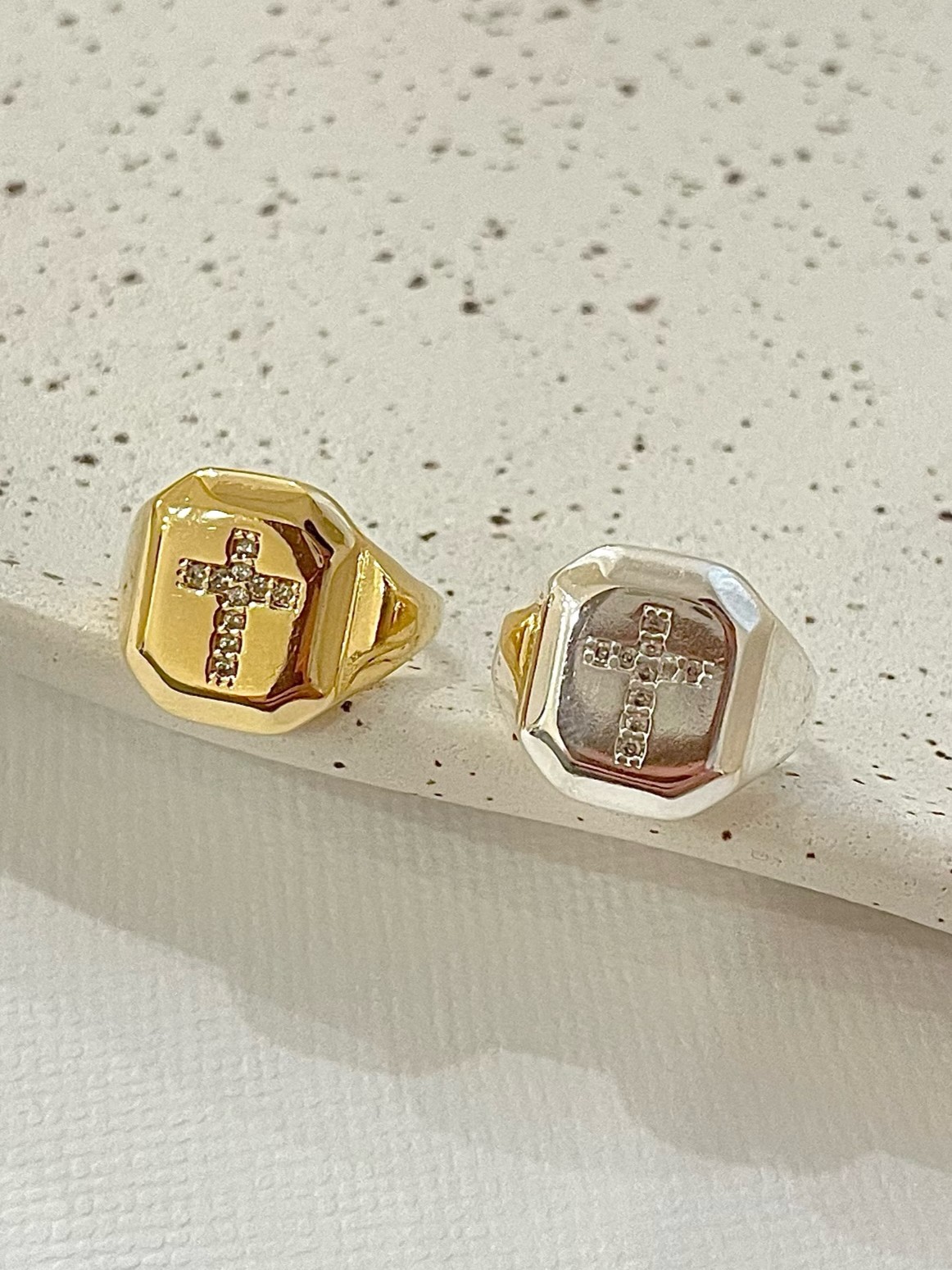 Anel Cruz Cravejado Dedinho, peça de regulagem com uma cruz cravejada na parte superior, indicada para ser usada no dedo mindinho (dedinho), veste do tamanho 8 ao 14.