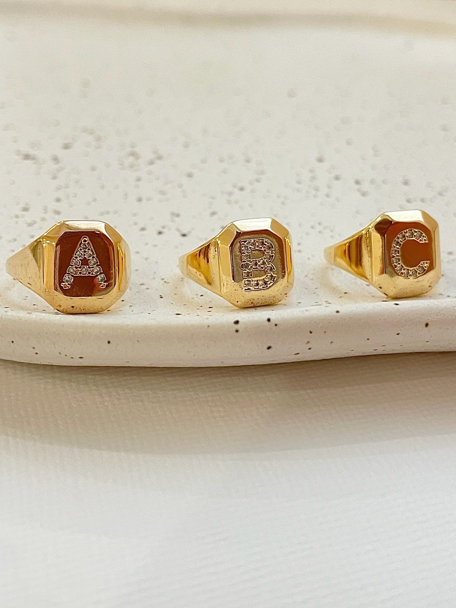 Anel Letra Cravejada Dedinho, peça de regulagem com a letra cravejada na parte superior, indicada para ser usada no dedo mindinho (dedinho), veste do tamanho 8 ao 14.