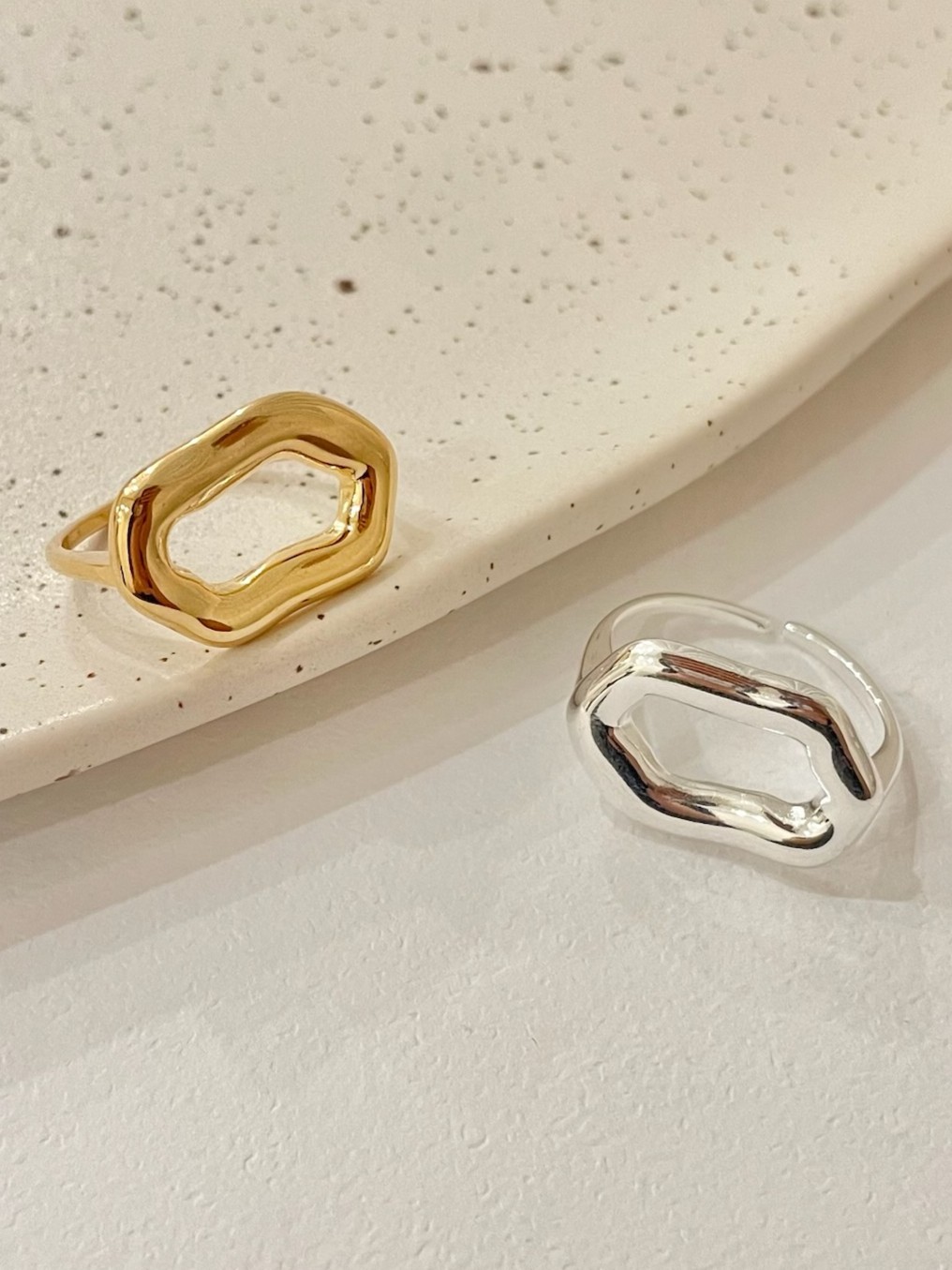 Anel Martina, peça de regulagem com formato oval orgânico e vazado no meio, possui duas variações de tamanho.