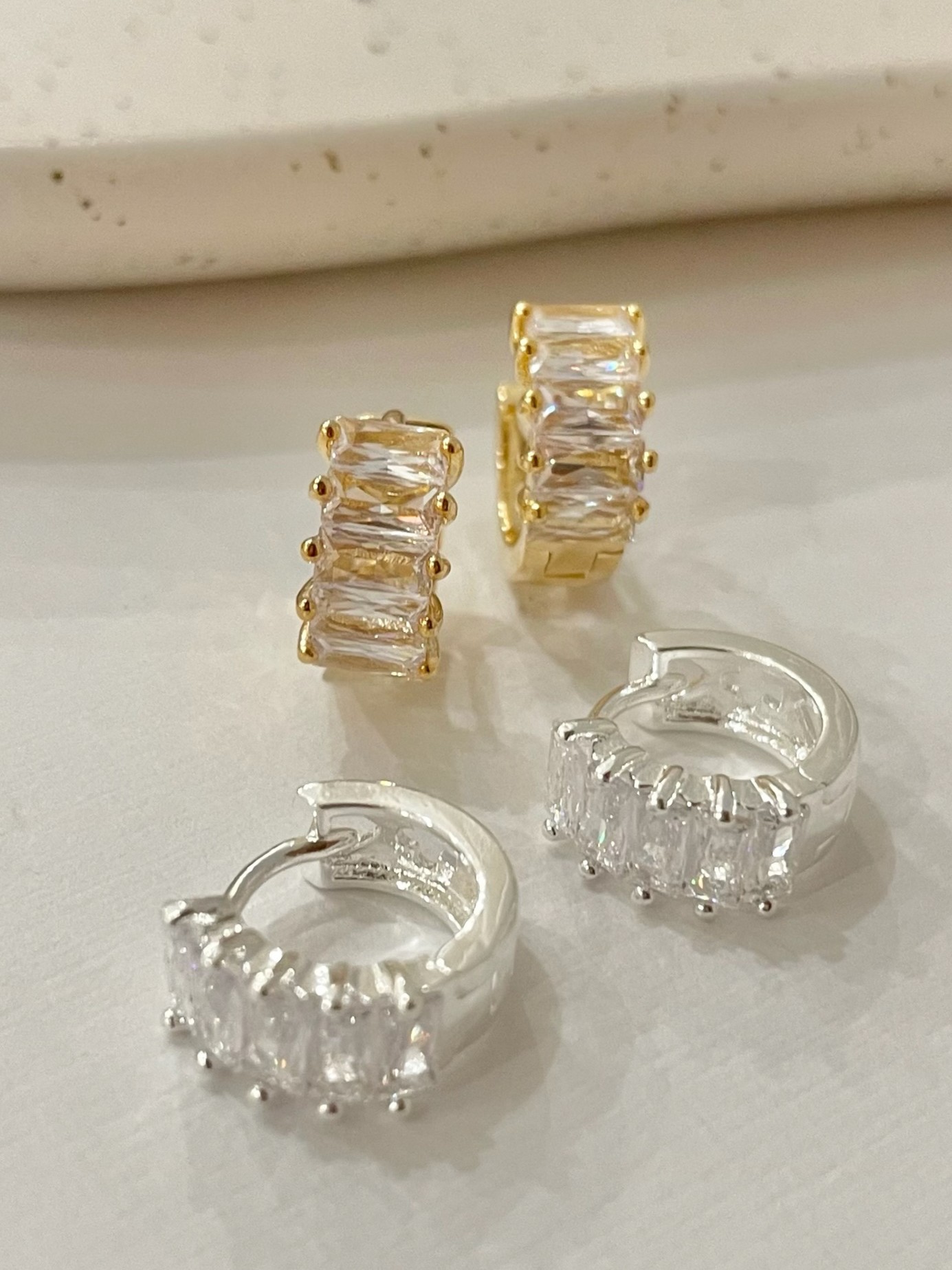 Argola Cássia, peça pequena com cinco zircônias retangulares na horizontal, fechamento em click.