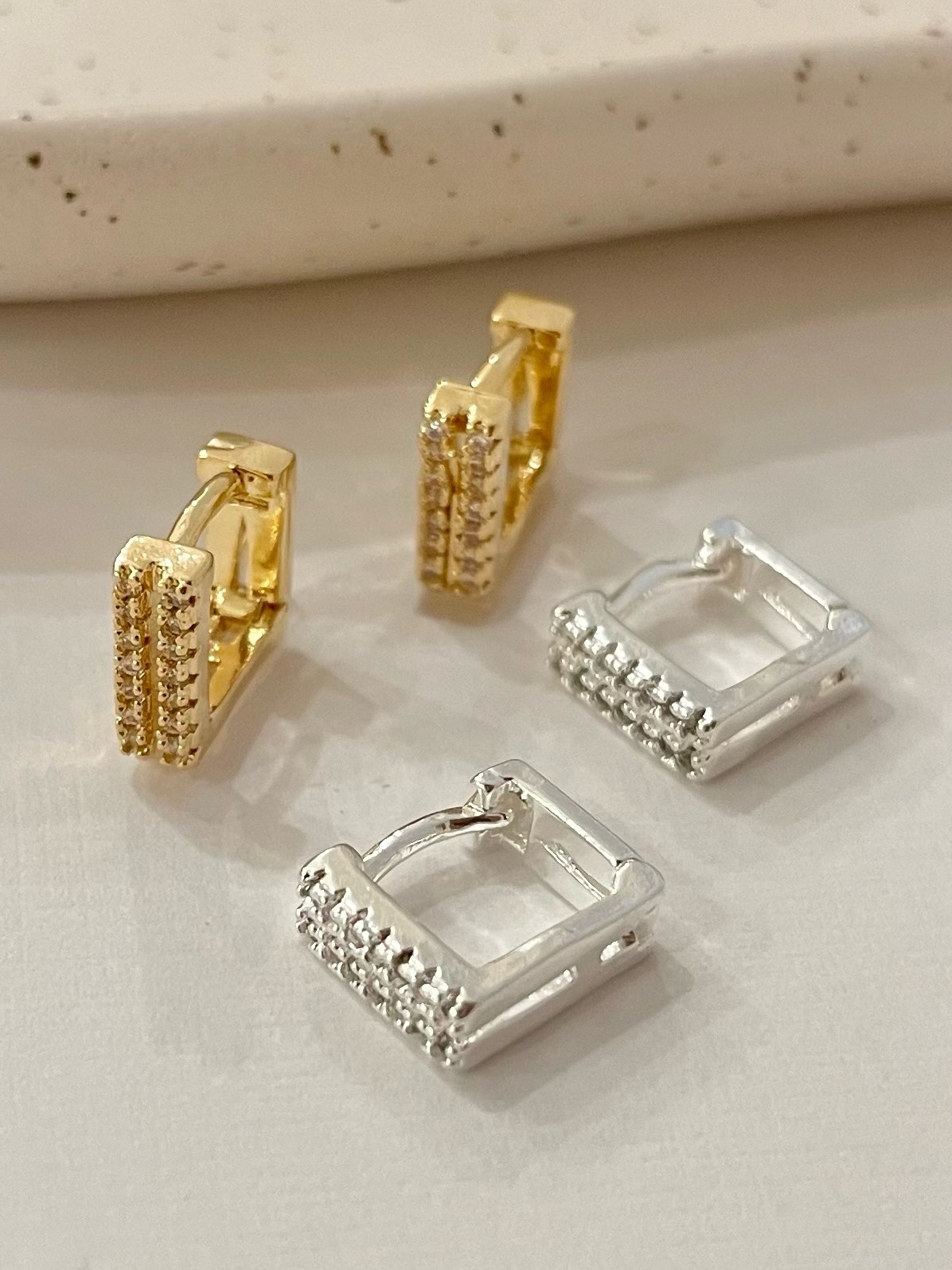 Argola Isadora, peça pequena em formato retangular com 2 fios cravejados, possui fechamento em click, ideal para montar mix de argolas.
