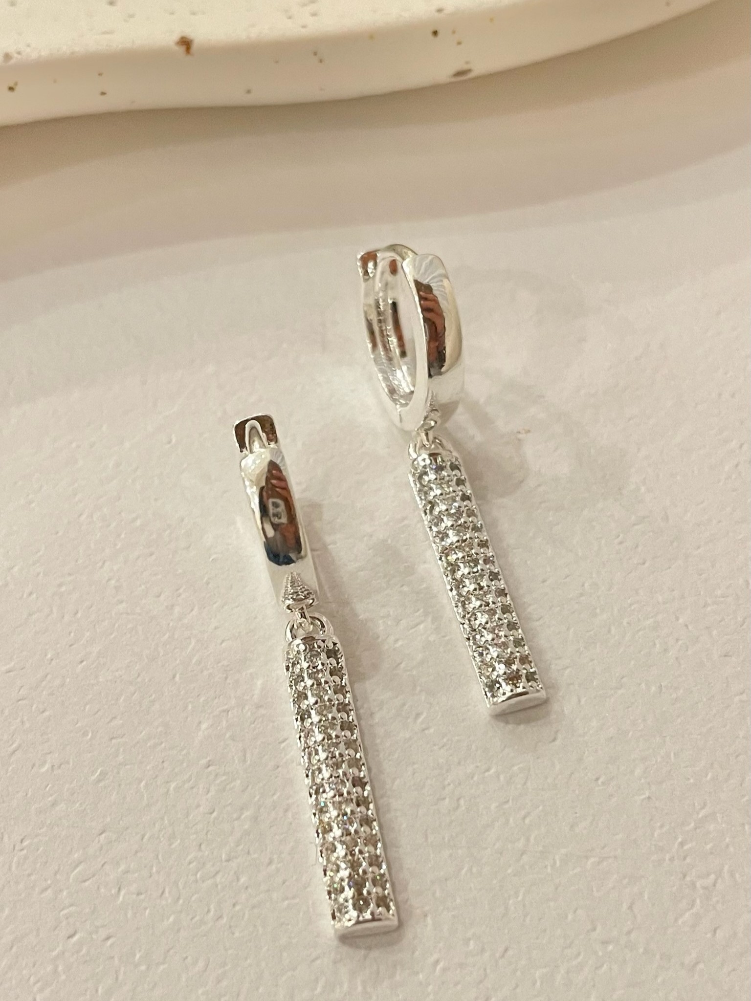 Argola Laís, peça pequena com pingente de palito grosso cravejado, possui fechamento em click, perfeita para dar um toque de estilo no dia a dia.