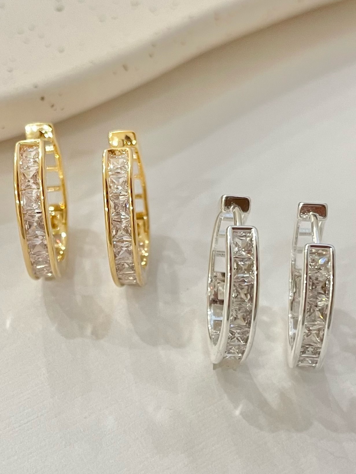 Argola Monique, peça média com zircônias quadradas cristais na frente e vazada na parte de trás, fechamento em click.