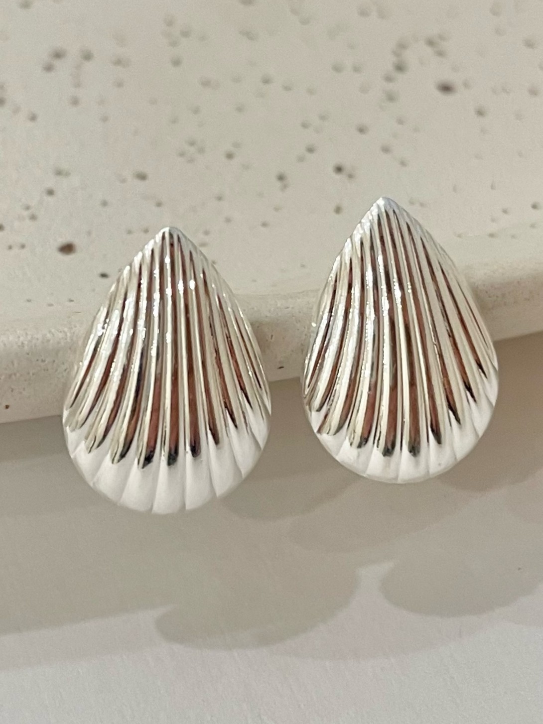 Brinco Amália, peça pequena em formato de gota com listras e fechamento em tarraxa, ideal para dar um toque de estilo ao look.