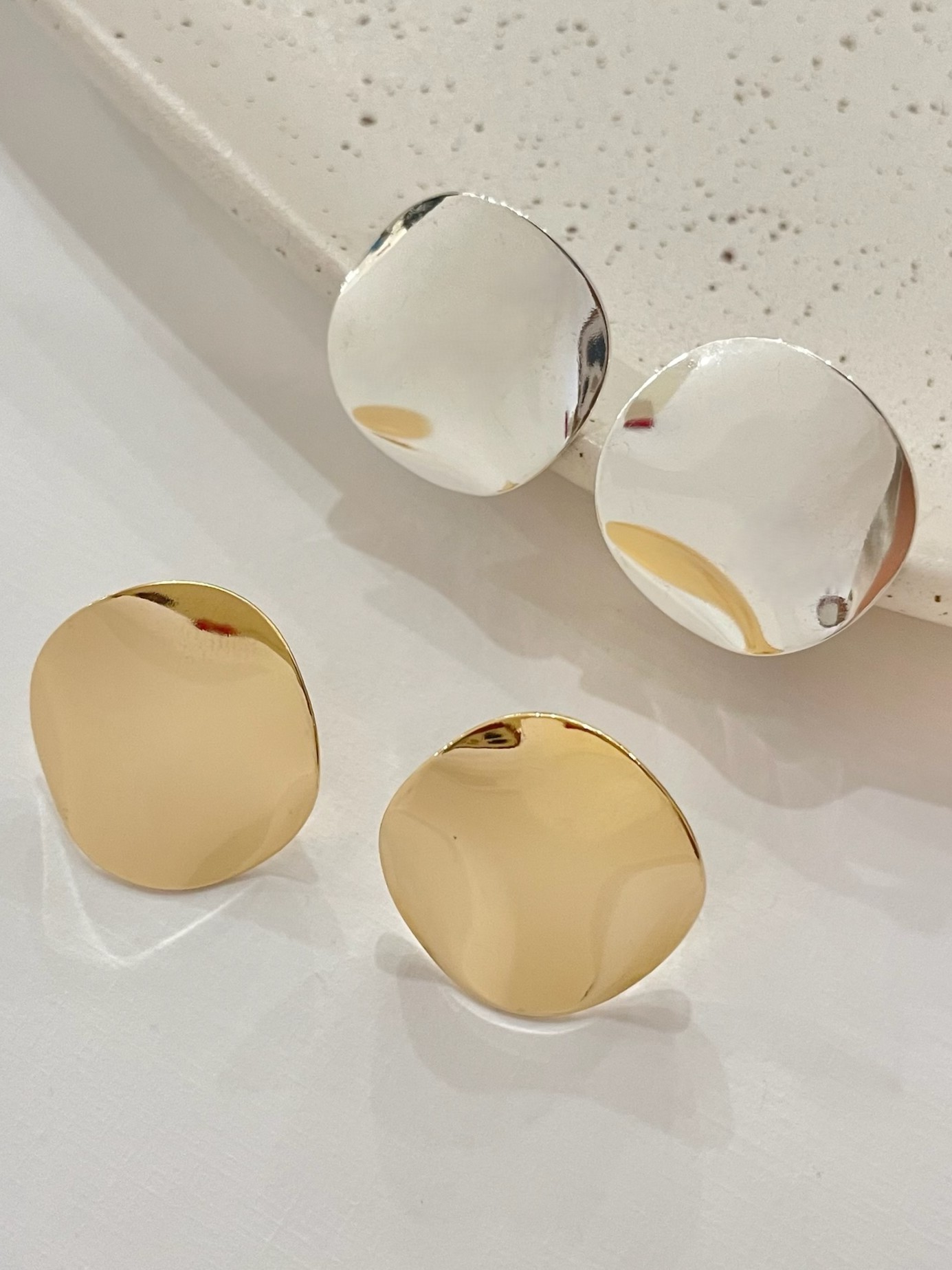 Brinco Dara, peça média, redonda, com uma leve ondulação e lisa, fechamento em tarraxa.