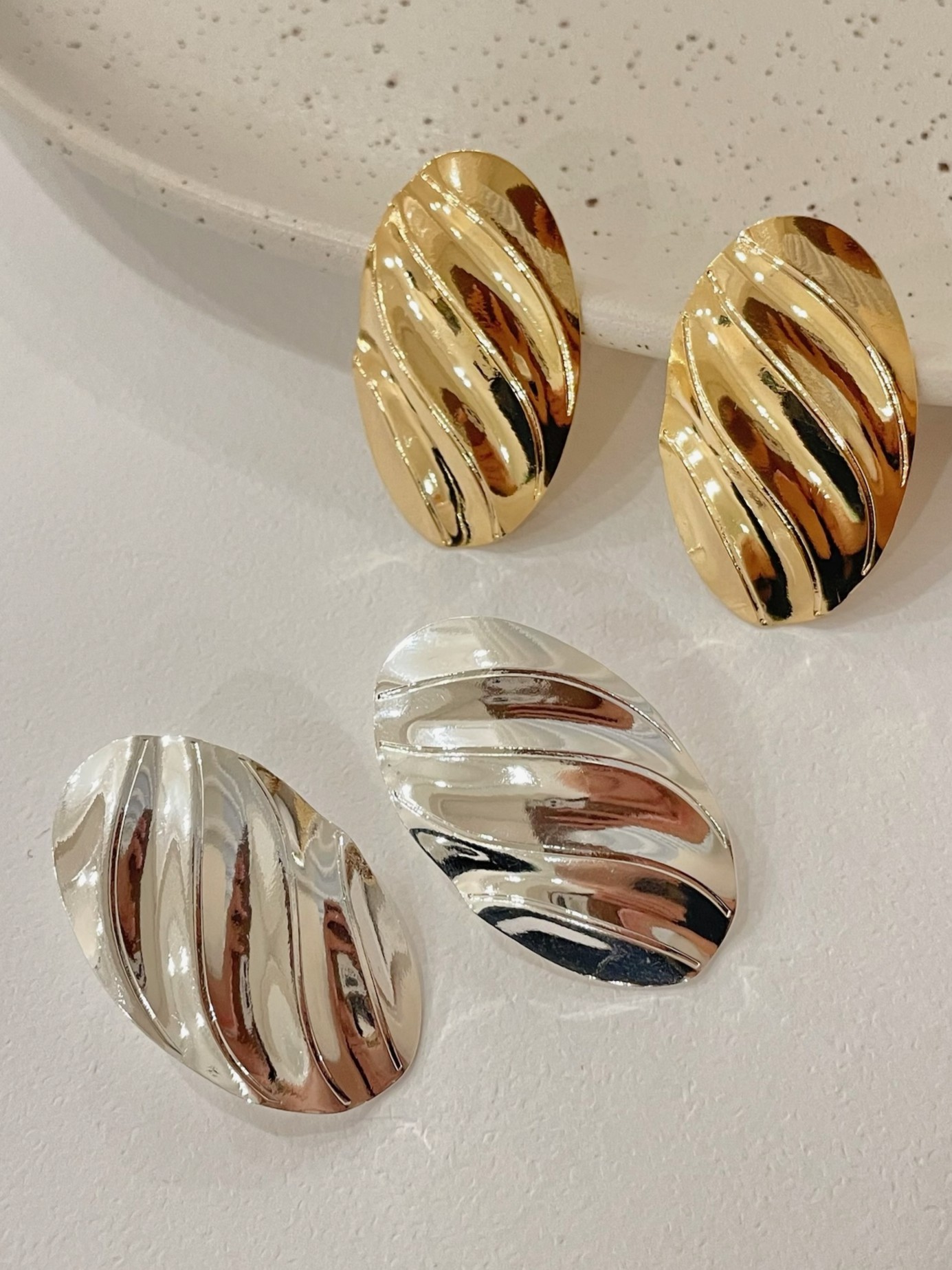 Brinco Lari, peça grande com o formato oval com listras diagonais, fechamento em tarraxa, perfeita para aquela ocasião especial.