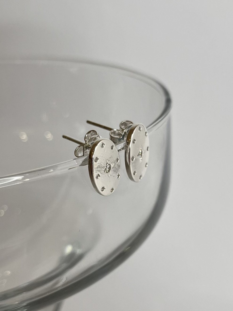 Brinco Lunelli, brinco de tarraxa oval com pontos de luz na borba e estrela no meio. Modelo utiliza o Brinco Lunelli no primeiro furo.