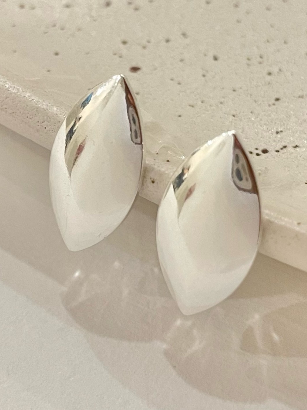 Brinco Maria Antônia, peça pequena com formato de losango arredondado e fechamento em tarraxa.