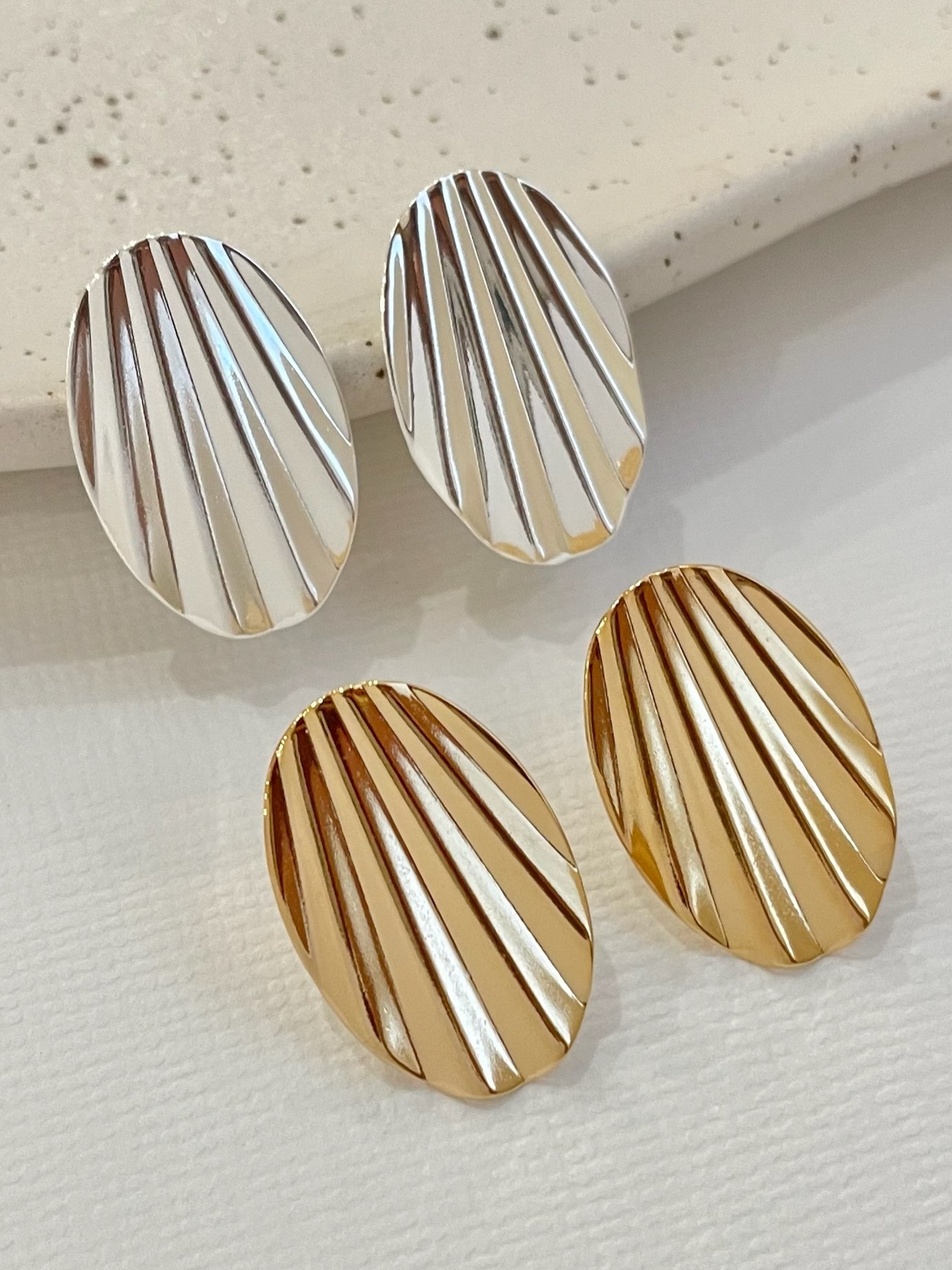 Brinco Noemi, peça média em formato oval com frisos, fechamento em tarraxa, perfeita para dar um toque de estilo no look.