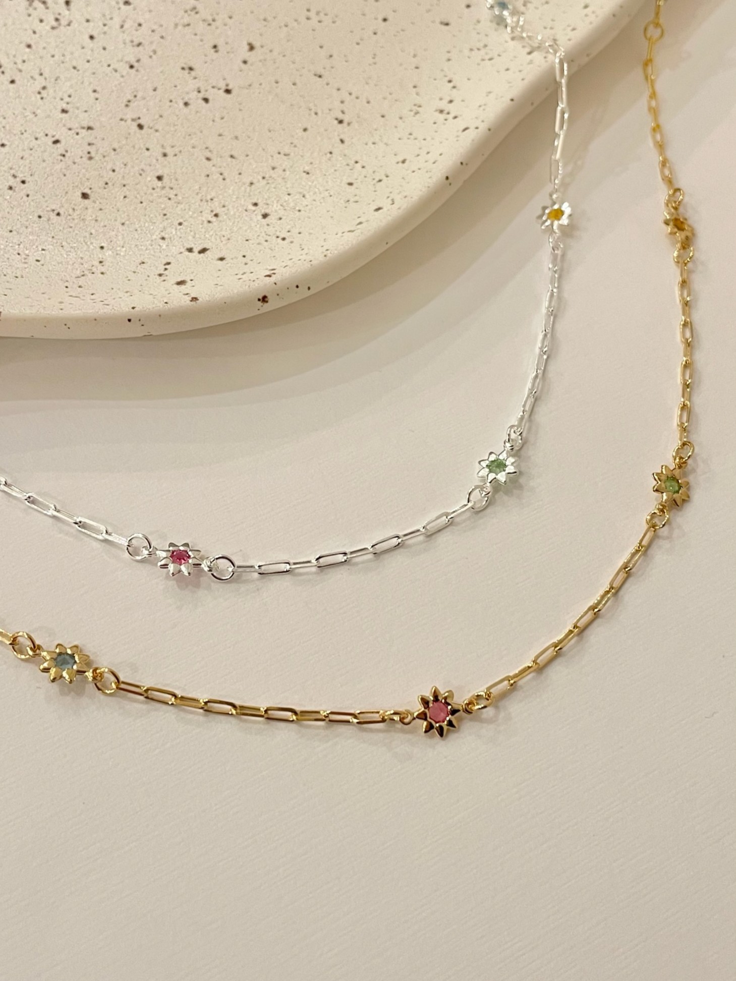 Choker Flora, peça com mini elos e flores com zircônias coloridas em todo seu comprimento, possui 40 cm de comprimento + 5 cm de extensor.