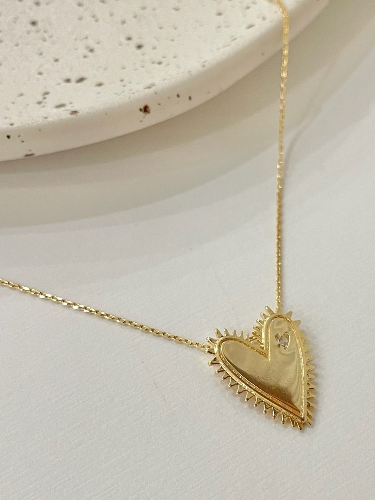 Colar Giovana, peça com mini elos com pingente de coração com triângulos na borda, possui 43 cm de comprimento.