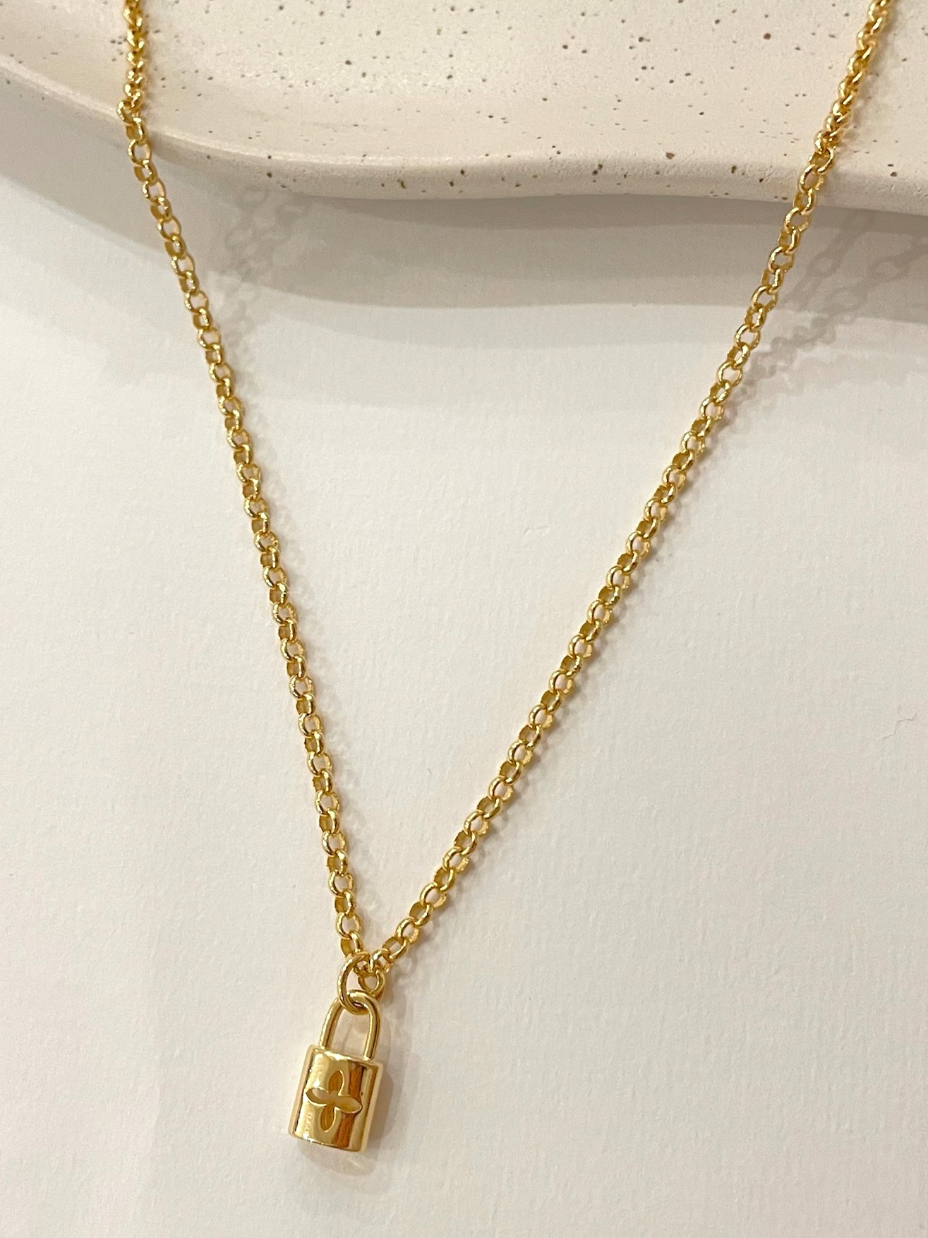 Colar Jully, peça com elos portugueses com pingente de cadeado com um trevo no meio, possui 45 cm de comprimento + 5 cm de extensor.