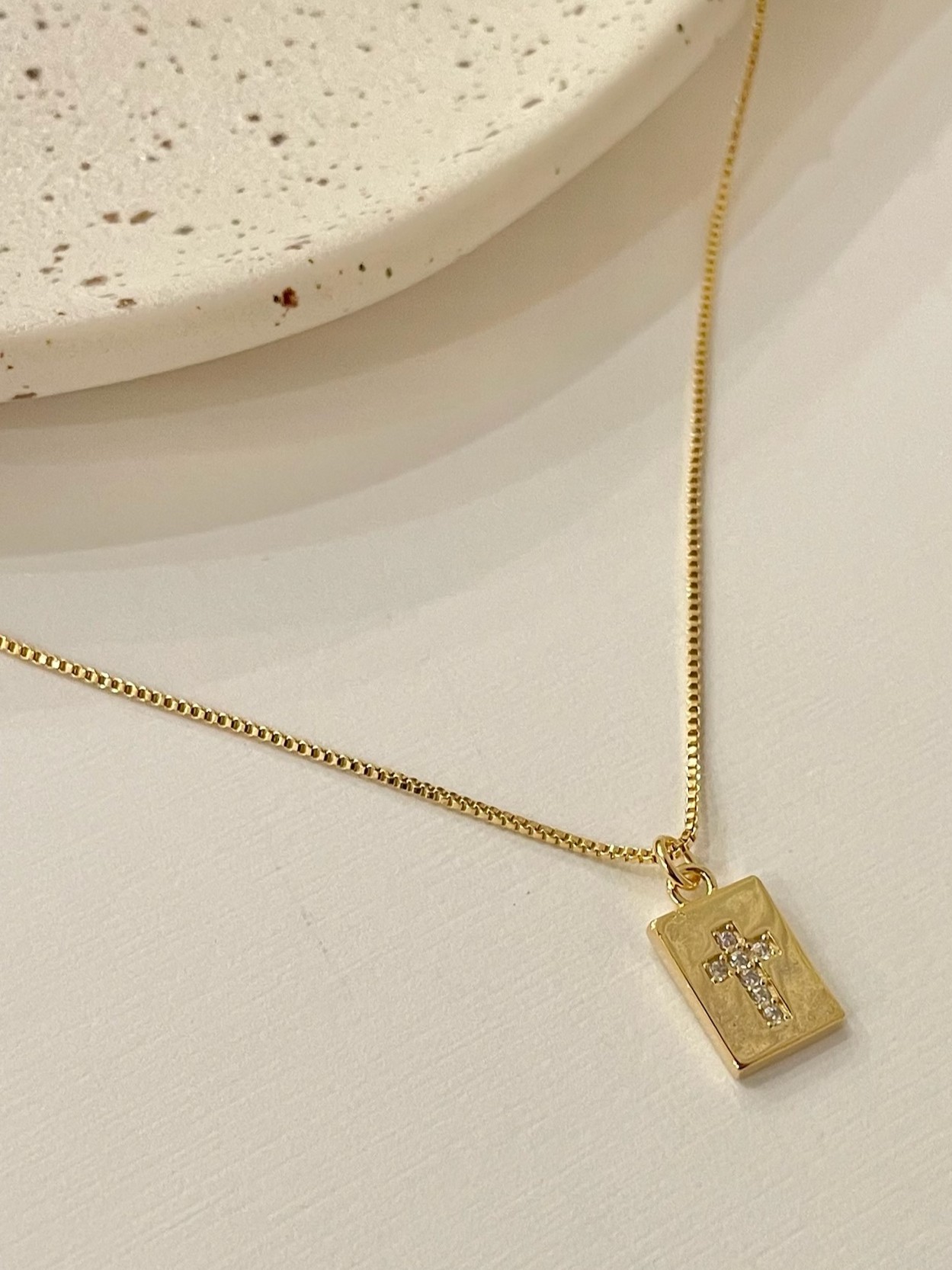 Colar Maria, peça em veneziana com pingente de placa lisa e cruz cravejada, possui 46 cm de comprimento + 5 cm de extensor.
