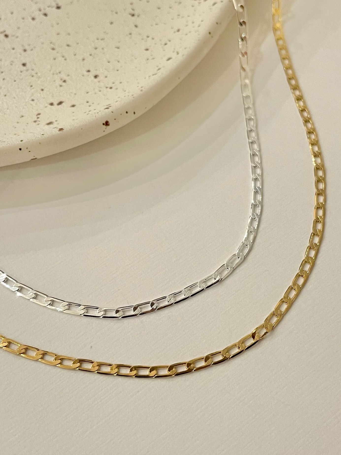 Colar Melinda, peça com elos alongados e flat, possui 42,5 cm de comprimento.