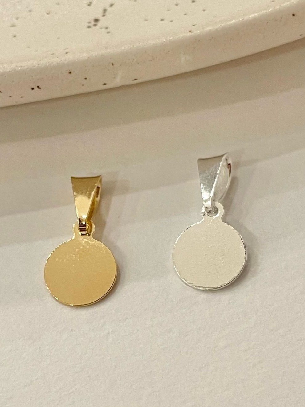 Pingente Medalha Pequena, peça pequena em formato redondo e lisa.