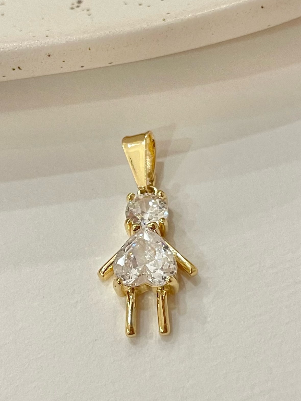 Pingente Menina Cristal, peça em formato de bonequinha, com uma zircônia coração e redonda cristal.
