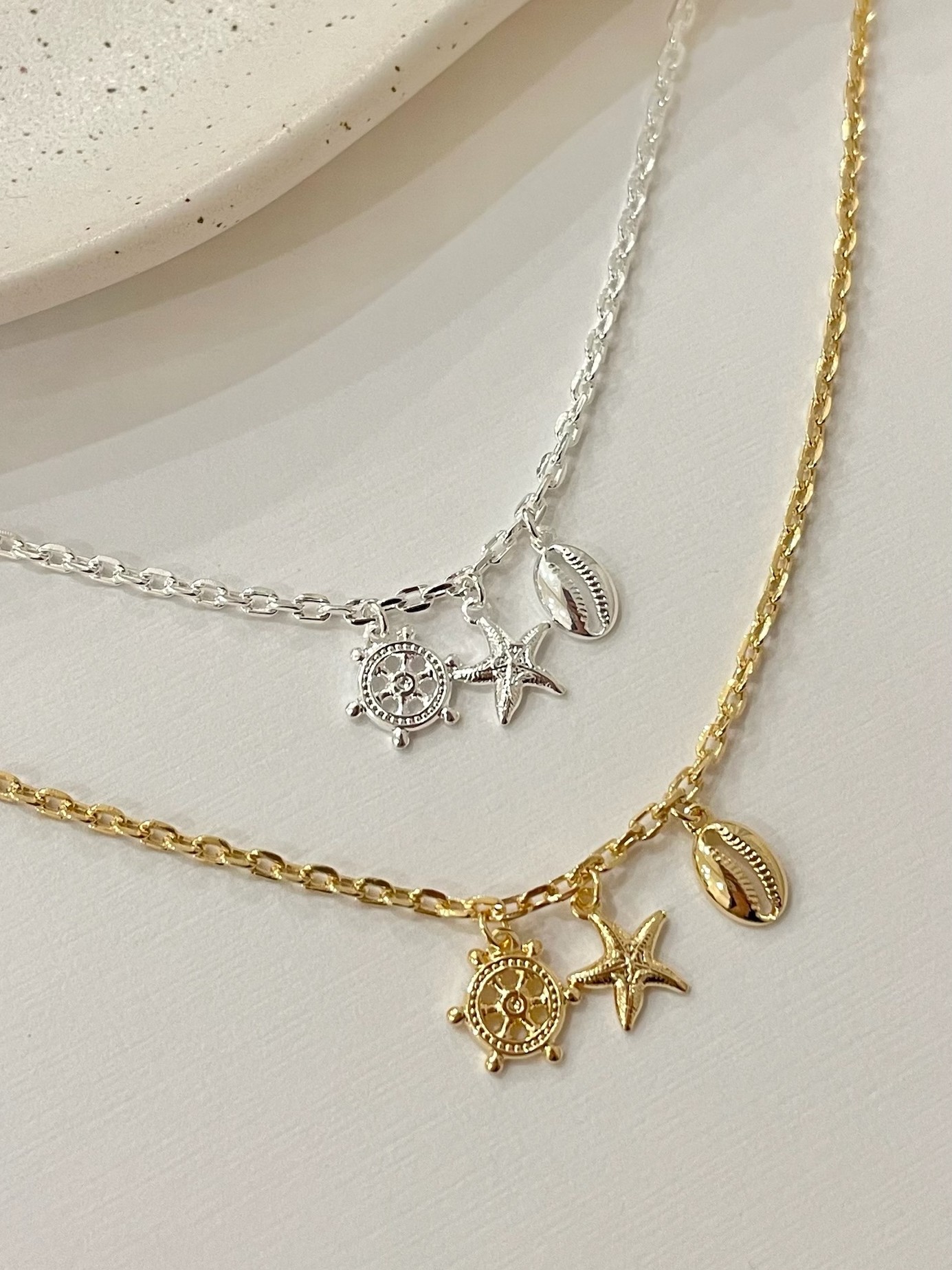 Tornozeleira Al Mare, peça com mini elos retangulares, e 3 pingentes, sendo 1 búzios + 1 estrela do mar + 1 timão ou roda do leme, possui 22 cm + 5 cm de extensor permitindo a regulagem.