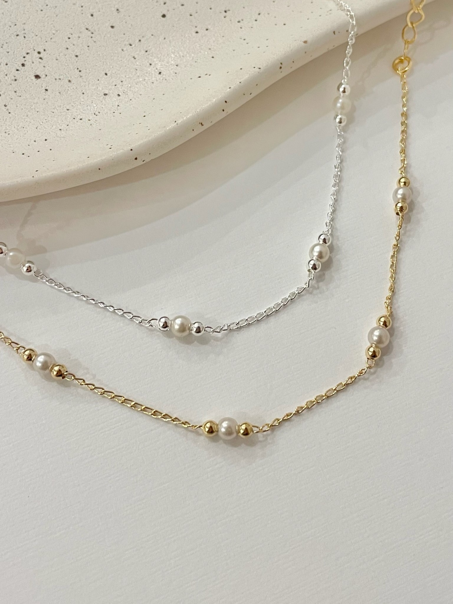 Tornozeleira Pérolas Com Bolinhas, peça com mini elos intercalado com bolinhas lisas e pérolas, super delicada e a cara do verão!! Possui 21,5 cm + 5 cm de extensor permitindo a regulagem.