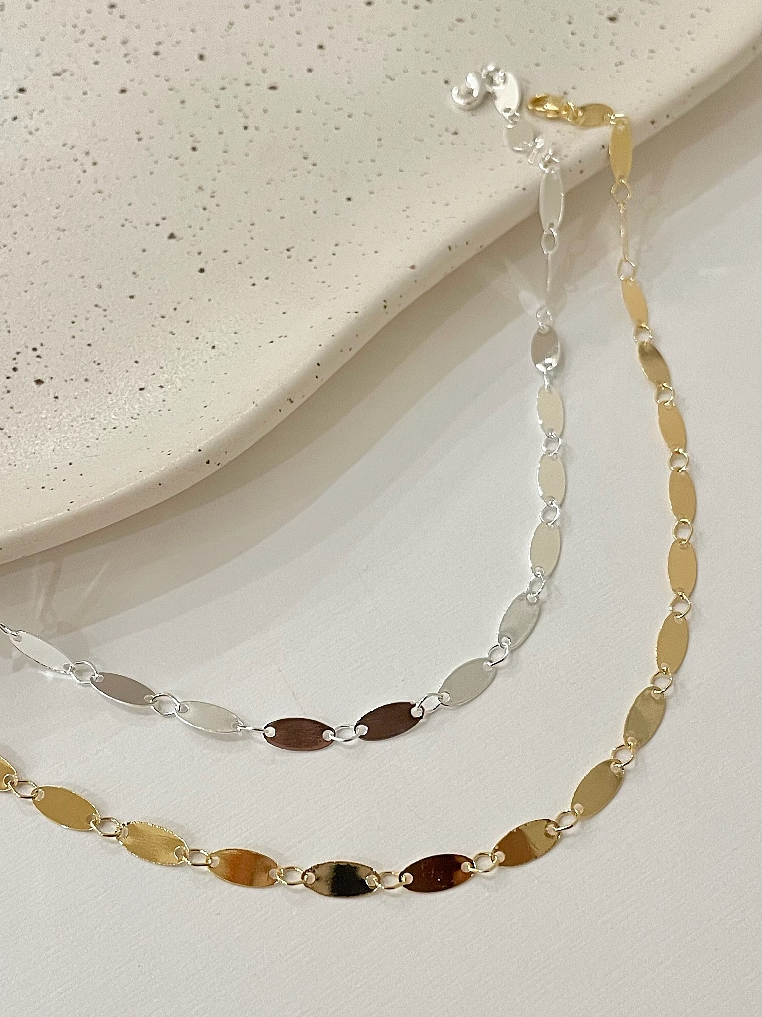 Tornozeleira Plaquinhas Ovais Lisas, peça com em formato oval alongadas lisas, perfeita para quem gosta de peças que saem do obvi. Possui 23,5 cm + 4 cm de extensor permitindo a regulagem.